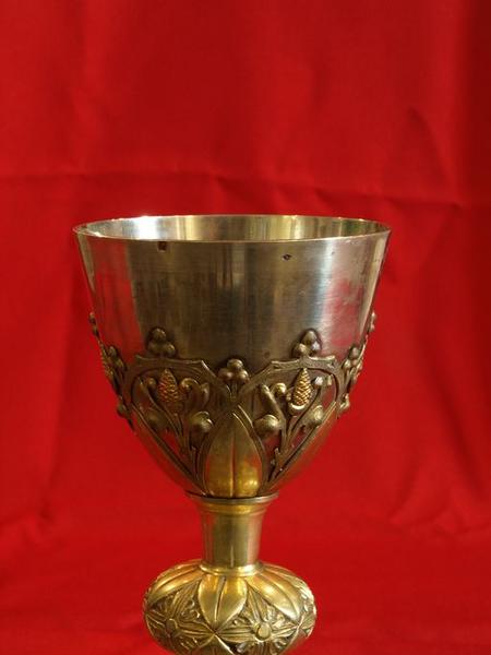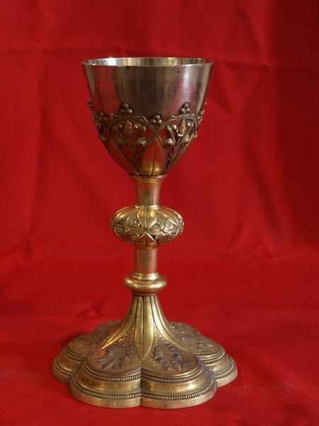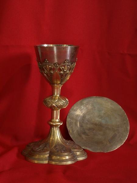Ce calice est de plan polylobé, le nud de la tige est en forme de boule aplatie et la fausse coupe est ajourée. Le pied et la fausse coupe sont en cuivre doré ; la coupe en argent est dorée à l'intérieur. Le décor est estampé, repoussé et ciselé. La patène de plan circulaire est en argent doré.