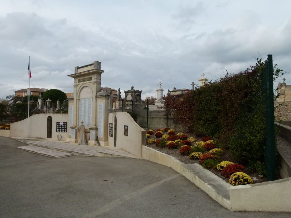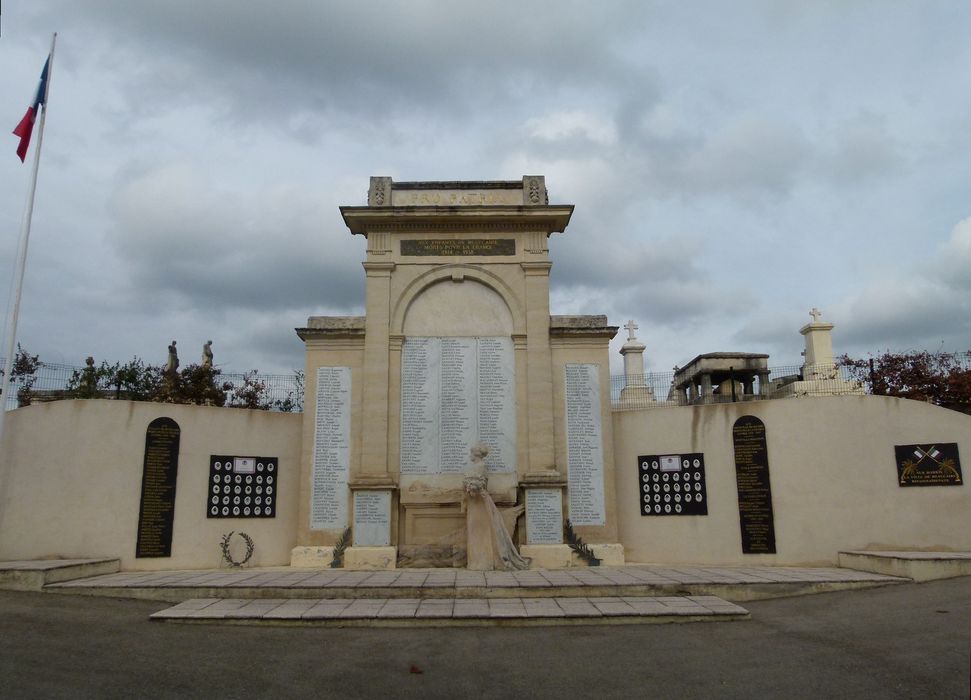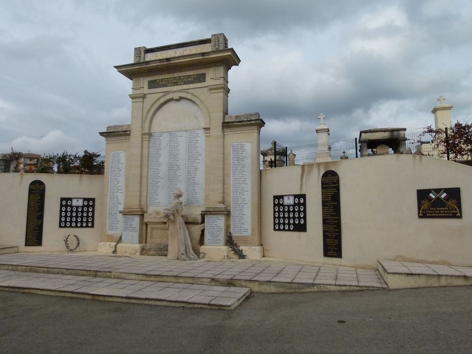 devise au sommet du fronton, transcription : pro patria ; dédicace sur plaque de marbre noir, transcription : aux enfants de Beaucaire morts pour la France 1914 1918 ; noms des morts.Signature à la base : «RAYMOND SUDRE Sc[u]lp[teu]r / MAX RAPHEL arch».