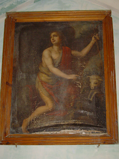Ce tableau est une huile sur toile représentant le jeune saint Jean-Baptiste, désignant l' agneau qui préfigure la Passion du Christ. La position du saint est très originale tout comme son geste désignant l' agneau. En effet, saint Jean-Baptiste est plutôt représenté baptisant le Christ ou alors figuré seul mais debout, à côté de l' animal. Le tableau est signé en bas à gauche "Bido" à l' encre doré. Ce nom de peintre n' a pu être identifié, il s' agit sans doute d' un peintre actif localement. L' utilisation de l' encre dorée pour signer est très courante au 18e siècle, en particulier dans le canton de Montgiscard, comme en témoignent les tableaux de Marguerite de Michel conservés dans l' église paroissiale de Montgiscard. C' est l' une des raisons, avec le traitement de la facture de la toile, qui permet de dater cette oeuvre vraisemblablement du 18e siècle. Le cadre ne paraît pas remonter cependant au-delà du 19e siècle.