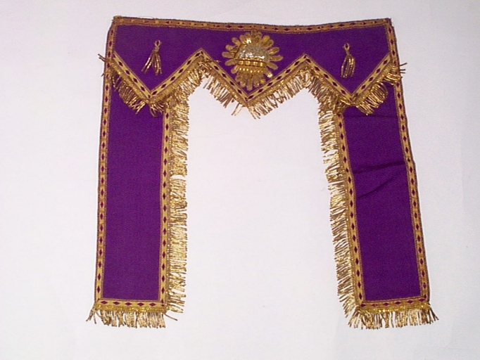 soie (violette) : tissu façonné, application sur textile ; fil métal : doré
