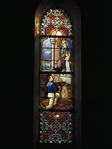 Verrière-ex-voto (?) de la baie 8 : Jeune marin offrant un maquette de bateau à la Vierge