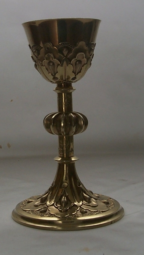 Les 2 poinçons sont sur la patène et le pied ; poinçon de garantie sur la coupe et la fausse coupe ; fabricant : losange vertical, lettres M T séparées par 2 flêches en sautoir. Inscription gravée sur la patène : AGNUS DEI PANIS VIVUS.