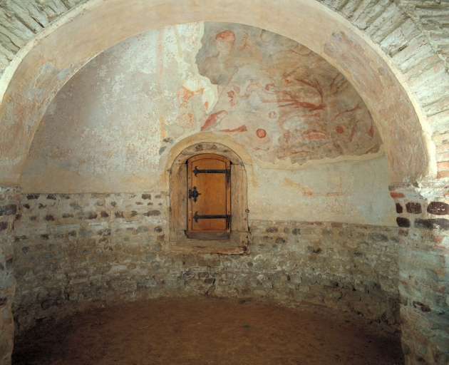 Trois peintures monumentales couvraient le cul-de-four de l'abside lorsqu'elles furent découvertes en 1839. La plus ancienne, au trait ocre rouge et bleu daterait de la limite des 2e et 3e siècles et représente la déesse Vénus nageant dans les eaux parmi les poissons. Elle a été recouverte au 6e ou au 7e siècle par un badigeon blanc sur lequel sont inscrits, à la peinture rouge, des caractères en bas latin. Il ne reste que quelques vestiges de cette peinture. Au début du 17e siècle (1702), la chapelle est reconsacrée au culte catholique. Il est probable qu'on ait posé une troisième peinture, blanche à traits noirs, détuite elle en 1839.