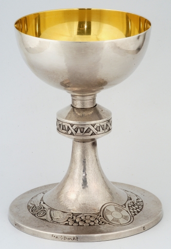 "Les deux poinçons sont sur la coupe, le pied et la patène. Inscription sur la patène : EGO SUM VIA ET VERITA ET VITA ; nom gravé sur la bate : Fra Donat ; poinçon de fabricant : losange horizontal lettres D et T séparées par une colombe "à l'égyptienne"."