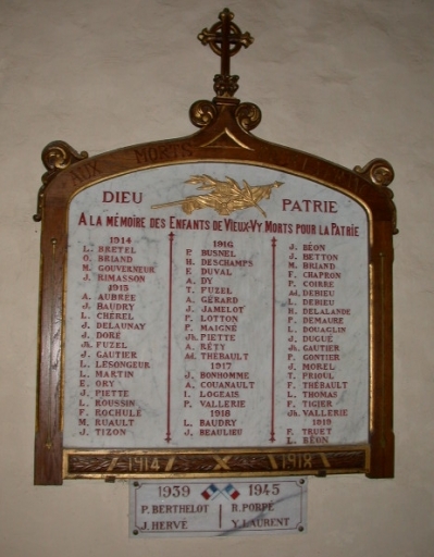 AUX MORTS POUR LA France / 1914 1918. DIEU PATRIE / A LA MEMOIRE DES ENFANTS DE VIEUX VY MORTS POUR LA PATRIE. [Les initiales des prénoms et les noms de famille sont inscrits par ordre alphabétique, par année de guerre sur 3 colonnes].