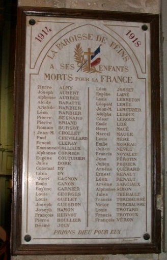 Inscription gravée et peinte en doré : 1914 1918 / LA PAROISSE DE FEINS / A SES ENFANTS / MORTS POUR LA FRANCE / [liste des morts sur deux colonnes (prénom, nom) par ordre alphabétique] / PRIONS DIEU POUR EUX. Signature en bas à droite : FOLLIOT Vor.