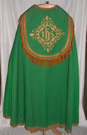 Sur le chaperon : I.H.S. dans un quadrilobe, représentation végétale.