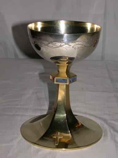 Couronne d'épines autour de la coupe du calice. Epis de blé et croix sur la patène.