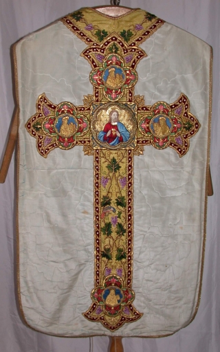 Sur la chasuble : Sacré-Coeur, Tétramorphe, rinceaux de vigne, croix fleuronnée.