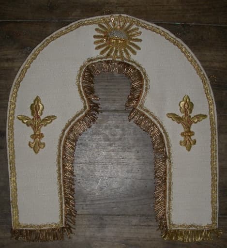 soie (blanche) : tissu façonné, application sur textile, adjonction d'éléments ; fil métal : doré