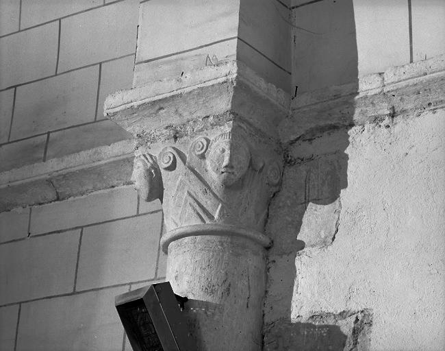 représentation humaine (tête) ; ornementation (feuille, tête, volute)