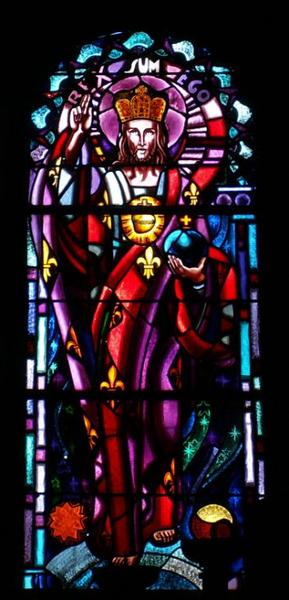 Cette verrière représente le Christ au Sacré-Coeur, couronné et bénissant le monde, accompagné de la mention REX SUM EGO.