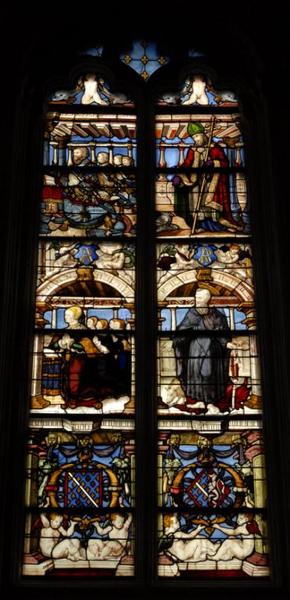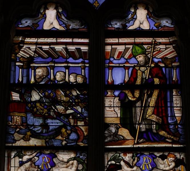 Les deux lancettes de cette verrière se divisent en trois registres.£Au registre inférieur, des putti portent les armoiries de René d'Anjou et celles de son épouse (mi-parti d'Anjou et de Chabannes).£Au registre central, Antoinette de Chabannes et ses cinq filles sont figurées en prière, présentées par saint Antoine l'ermite, au sein d'un décor d'architecture évoquant une loggia.£Deux cartouches portant le chiffre du couple représenté (R et A) marquent la transition avec le registre supérieur dans lequel sont figurés René d'Anjou et ses trois fils, en prière et présentés par saint René. A l'arrière plan, le décor d'architecture évoque également une loggia.£Le tympan d'azur est semé de fleurs de lys.