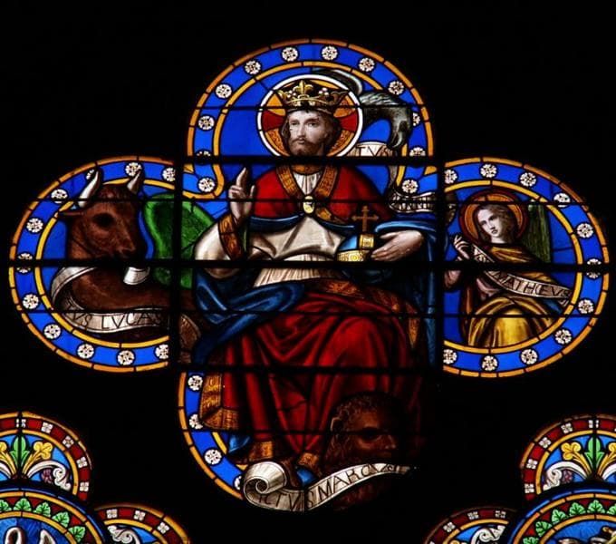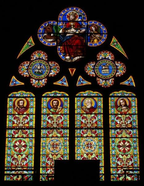 Verrière représentant les quatre évangélistes et le Christ-Roi