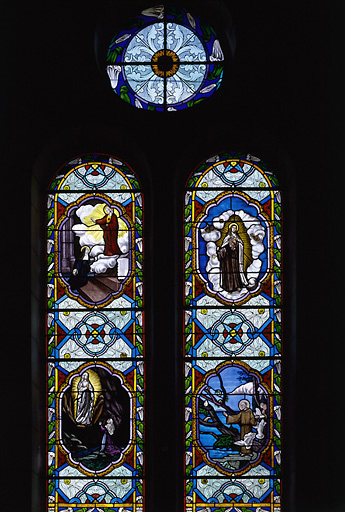 Education de la Vierge, saint Augustin d'Hippone et sainte Monique de Thagaste, vocation de saint Pierre et charité de saint Martin sur la verrière 9 ; grotte de Lourdes, Sacré-Coeur, saint François d'Assise parlant aux oiseaux et sainte Thérèse d'Avila sur la verrière 12