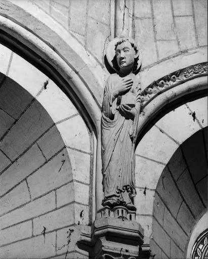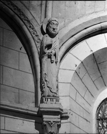 Les quatre statues de l'abside, placées à la retombé des nervures encadrant les trois baies du choeur, sont du dernier quart du 12e siècle (datation par travaux historiques). Il est vraisemblable que la statue isolée située aujourd'hui dans le bras sud du transept, ainsi que celles placées dans des niches à la façade occidentale, soient contemporaines. Il pourrait s'agir de statues ayant appartenu à la travée droite du choeur, déplacées lors de sa modification au 15e siècle. Les deux statues en façade, très dégradées, ont été mutilées à la Révolution.