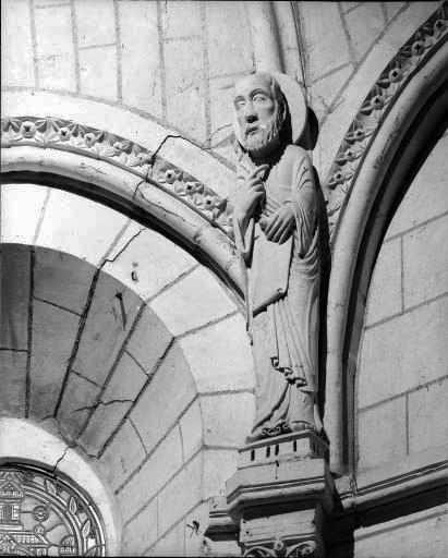 statue 1, à gauche de la baie1 : homme barbu, nimbé, tenant un pan de son manteau dans la main gauche£statue 2, entre la baie 1 et la baie 0 : femme nimbée, couronnée£statue 3, entre la baie 0 et la baie 2 : homme jeune imberbe nimbé tenant un livre fermé£statue 4, à droite de la baie 2 : homme âgé, barbu, nimbé, tenant de la main gauche un phylactère£statue 5, bras sud du transept : homme barbu, nimbé, aux cheveux longs, tenant un livre fermé£statue 6, façade ouest, contrefort sud : homme£façade ouest, contrefort nord : homme barbu, nimbé, tenant une palme