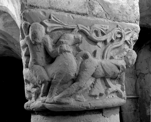 Le chapiteau de la colonne sud est orné de rinceaux et de palmettes sur toute la hauteur de la corbeille. Celui de la colonne nord, de composition analogue, présente aussi une scène figurée où l'on voit un homme chevauchant un animal fabuleux, sorte de dragon, et poursuivant une femme tombant à terre.