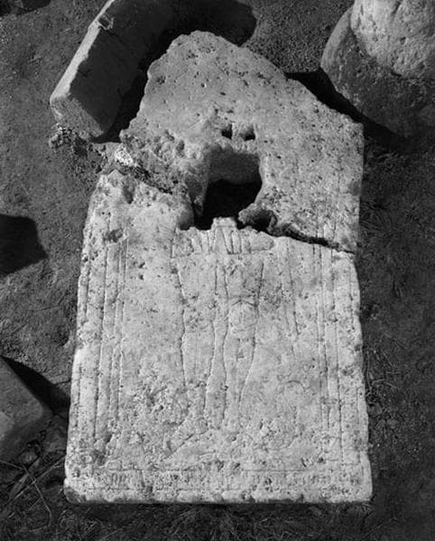 Dalle cassée en deux, percée au centre d'un trou, recouverte d'un motif gravé représentant, un homme en armure, dont on distingue les jambes et les longues poulaines. Sur le pourtour de la dalle, une bordure rectangulaire est sculptée en relief d'une inscription en lettres gothiques. La dalle est recouverte d'une fine couche de mousse empêchant une bonne lisibilité des lettres et des motifs.