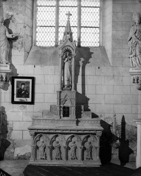 Autel tabernacle en pierre ; autel décoré d'arcatures dans lesquelles sont placées les statues des 4 évangélistes ; Gradin orné de quadrilobes. Tabernacle orné de rinceaux. Porte en bois ornée d'une croix en cuivre doré. Exposition en forme de dais supporté par 4 colonnettes, surmontée d'un pinacle. Statues en plâtre peint polychrome placées sous l'exposition.