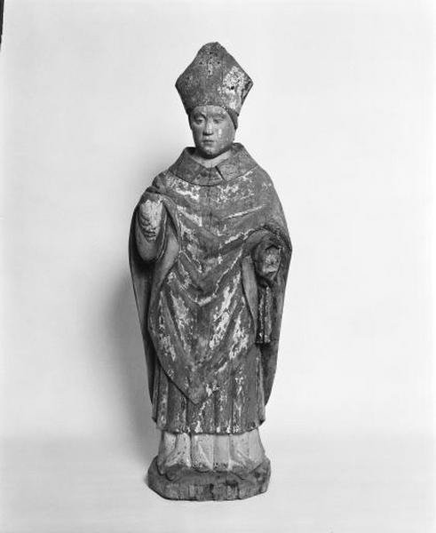 Statue en bois clair et tendre à intérieur plein ; les avant-bras sont rapportés et tenus par des tenons en bois ; le bord gauche de la manche est maintenu par des clous, ainsi que la croix de la mitre ; base de même nature que la statue, taillée dans la masse, et de forme rectangulaire
