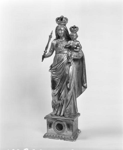 Intérieur plein et revers légèrement travaillé ; dorure à la feuille : manteau de la Vierge, voile, globe, vêtement de l'Enfant ; dorure à la poudre : visages et robe de la Vierge ; couronnes, globe et main, ainsi que le sceptre sont rapportés ; la statue est fixée sur socle