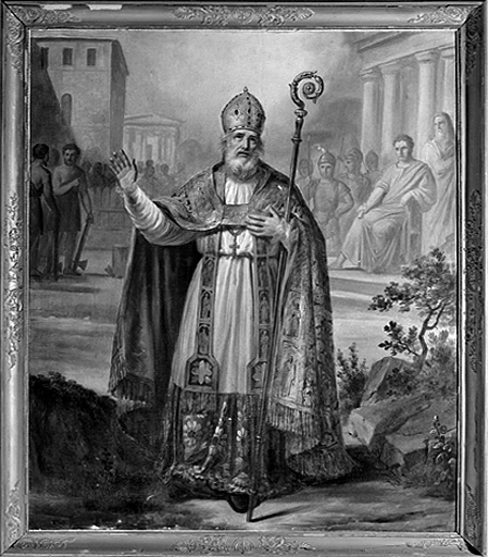 saint Denis : évêque, architecture urbaine, gouverneur : assis, soldat, bourreau : hache, foule