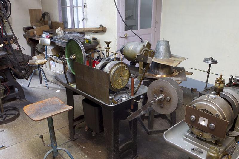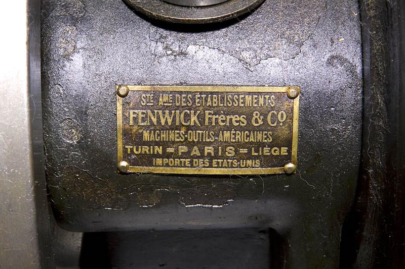 Plaque rivée sur la machine : S[ocié]té a[nony]me des établissements / Fenwick Frères & Co / Machines-outils américaines / Turin - Paris - Liège / importé des Etats-Unis. Plaque signalétique rivée sur le moteur : GPG Précision / Besançon / 23, rue de Vesoul / N° 111 968 Type MT 100 [...]