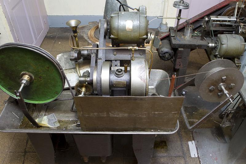 La ' raboteuse ' sert à lisser le fil cordé en bronze, fabriqué lors de la première passe sur la machine à faire les branches cordées, et à en égaliser le diamètre. Elle est fixée dans un bâti en fonte de fer associant quatre pieds, réunis deux à deux, et un bac de plan rectangulaire, profond de 10 cm et s'évasant vers le haut. L'opération nécessite une lubrification continue du fil, aussi un réservoir (en fonte) est-il suspendu sous le bac et l'huile qu'il contient conduite, par une pompe et un tuyau en cuivre, à l'entrée du fil dans la machine. Cette dernière est actionnée par un moteur électrique alternatif triphasé individuel, via deux poulies et une courroie en cuir ; le mouvement est aussi transmis à la pompe par une deuxième courroie et à la roue d'entraînement du fil à l'aide d'un renvoi d'angle à pignons.