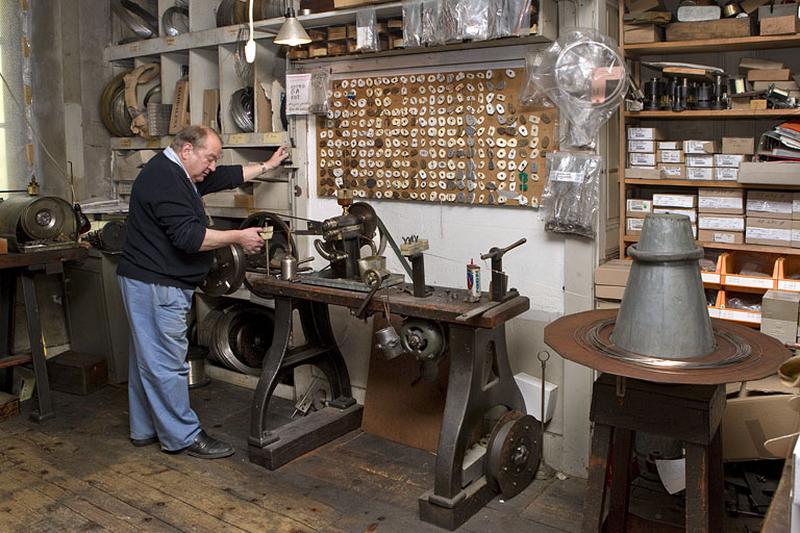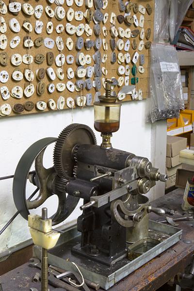 Le laminoir est utilisé à froid et en deux passes : pour aplatir le fil de bronze à la première, pour faire le drageoir (rainure dans laquelle s'emboîte le verre) et mettre en forme l'extérieur (avec décor le cas échéant) à la seconde. La partie travaillante des deux cylindres en acier, dont l'écartement est réglé par une manette graduée, est large de 3 cm et comporte trois rainures. Surmontés par un graisseur en verre et laiton, ils sont tenus par un support en fonte portant à l'arrière les engrenages et le volant. Celui-ci est mis en mouvement par un moteur électrique fixé sous le plateau et une courroie plastique, une deuxième courroie actionnant la bobine placée à l'extrémité gauche de l'établi. Ce dernier associe deux supports en fonte, chacun formé de deux pieds incurvés, à un plateau en bois feuillu épais de 6 cm. Lors de la première passe, le rouleau de fil est déposé sur une grosse bobine conique verticale en tôle galvanisée, placée sur un tabouret en bois résineux à quatre pieds. Cette bobine peut tourner sur son axe et une lame en acier faisant ressort frotte contre sa base pour régulariser son mouvement. Pour la deuxième passe, une bobine à noyau en bois et flasques en fer contenant le fil aplati peut être fixée verticalement à l'extrémité droite du plateau.