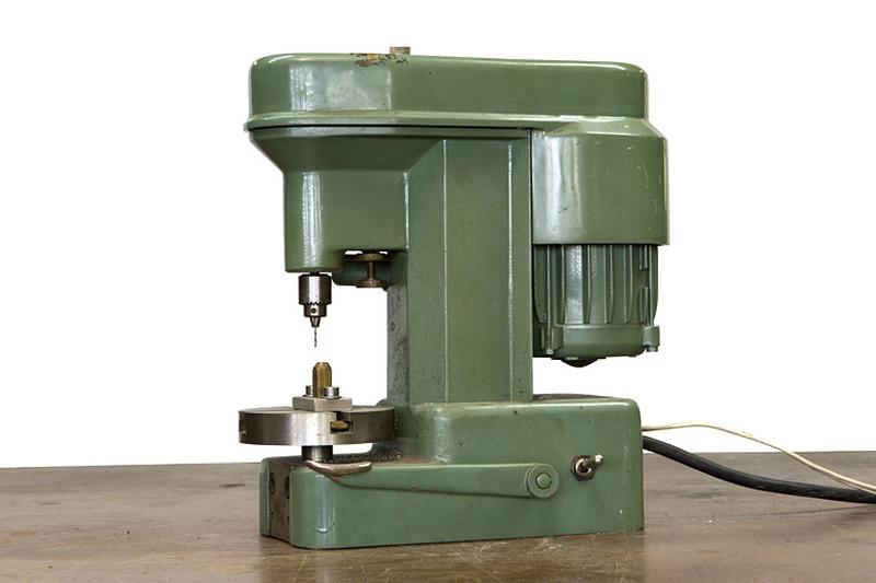 Cette perceuse de table est polyvalente. Elle est composée d'une colonne portant à l'avant le mandrin, à l'arrière le moteur électrique disposé verticalement et au-dessus la courroie de transmission. L'ensemble est protégé par un carter peint en vert. Un levier placé sur le côté droit commande la descente de la mèche.