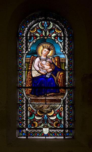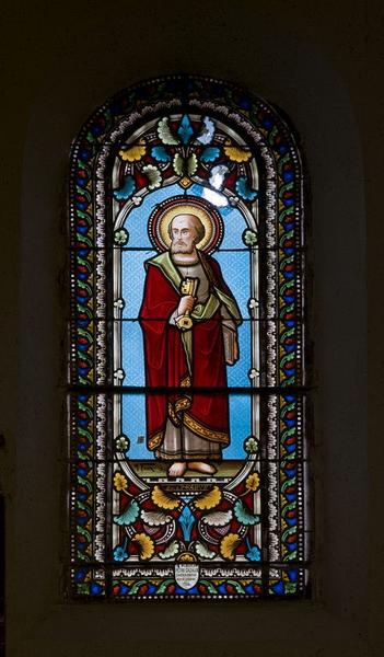 Notre-Dame de Buglose : baie 3 ; saint Pierre : baie 5. Personnages en pied dans un médaillon oblong entouré de motifs végétaux stylisés polychromes.