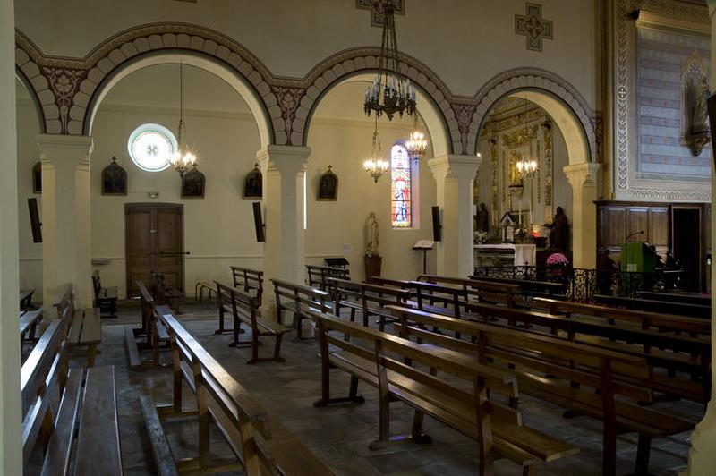 Le décor peint couvre l'intégralité des murs et voûtes du choeur et de la nef centrale. Sur la voûte du choeur, dans un médaillon circulaire, la scène de la désignation du Christ par Jean-Baptiste (Ecce agnus dei) ; aux angles, 4 médaillons avec symboles eucharistiques (pélican, agneau, calice, coeur) ; sur le cul-de-four de l'abside, une croix pattée et le triangle trinitaire avec les inscriptions PATER, FILIUS et SPIRITUS (aux angles) et DEUS (au centre) ; sur les murs de l'abside, entre les baies, 4 panneaux à fond doré représentant des anges en pied (inspirés des primitifs italiens) portant les livres des Evangiles ; sur les murs nord et sud du choeur, des bandeaux semés de monogrammes M.A. (Vierge) et S.A. (sainte Anne) et des niches feintes à arc trilobé et dôme néo-byzantin encadrant les statues (réelles) de Notre-Dame de Lourdes (au nord) et de sainte Anne (au sud). Vaisseau central : faux doubleaux à frise de palmettes et de coeurs sur la voûte ; croix de consécration peintes au-dessus des grandes arcades.