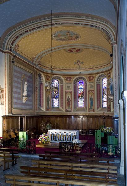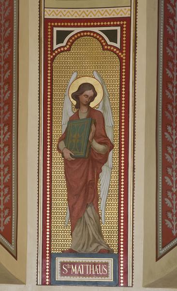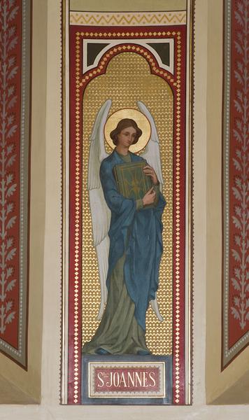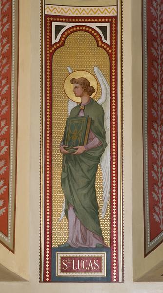 Inscription concernant l'iconographie : VOICI L'AGNEAU DE DIEU (sur le médaillon central de la voûte du choeur) ; S.tus LUCAS, S.tus MATTHAEUS, S.tus JOANNES, S.tus MARCUS (sur des cartels peints sous les anges aux évangiles) ; VOCALIS NOMEN EJUS JOANNEN, LIBER GENERATIONIS J.C., IN PRINCIPIO ERAT VERBUM, INITIUM EVANGELII (sur des cartouches polylobés au-dessus des anges aux évangiles).