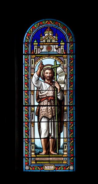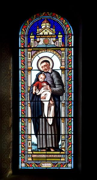 Sacré-Coeur : baie 0 ; saint Jean-Baptiste : baie 1 ; saint Vincent de Paul : baie 2 (personnages en pied avec fond de paysage en camaïeu bleu, sous un dais architecturé pour les baies 1 et 2 ; bordure à motifs végétaux polychromes). Baies 3 à 10 : rinceaux en S avec perles et palmettes en grisaille, bordures à motifs végétaux polychromes.