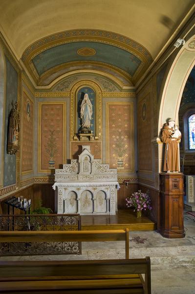 Monogrammes M.A. (Vierge) et S.J. (saint Joseph) sous les arcs de l'autel, entre des bouquets de roses et de lys ; coeur sacré de Marie (Vierge), croix et lys (saint Joseph) en relief sur la porte du tabernacle ; rinceaux sur les gradins. Statues : Notre-Dame de Lourdes, saint Joseph à l'Enfant.