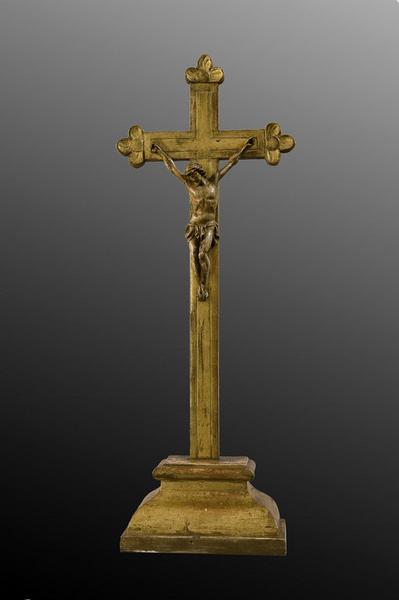 Chandeliers : base triangulaire sur pieds boules, noeud en urne, tige en balustre, bobèche en vase Médicis, binet. Croix : base rectangulaire moulurée en talon renversé, croix emboîtée, bras du Christ rapportés aux épaules.