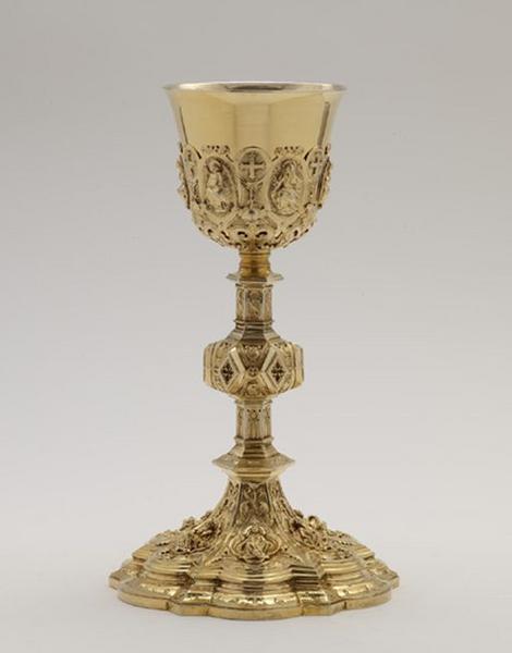 Calice à pied polylobé (six lobes et redents), noeud aplati à cabochons entre deux collerettes hexagonales, fausse coupe à bordure découpée et coupe légèrement évasée, en argent doré. Décor en bas-relief, décor en demi-relief sur le pied et la coupe (personnages dans les médaillons), fonds amatis.