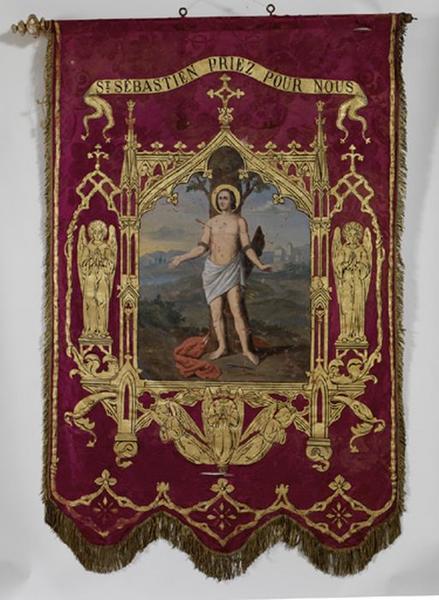 Saint Sébastien est le patron de l'édifice ; il est associé à saint Roch, autre saint invoqué contre les maladies contagieuses. La restauration de la bannière, en 2006, a eu pour but la présentation de l'objet, en choisissant pour cela la face du saint Roch : la face du saint Sébastien a été doublée d'une toile de coton cousue ne laissant visible que la scène peinte.