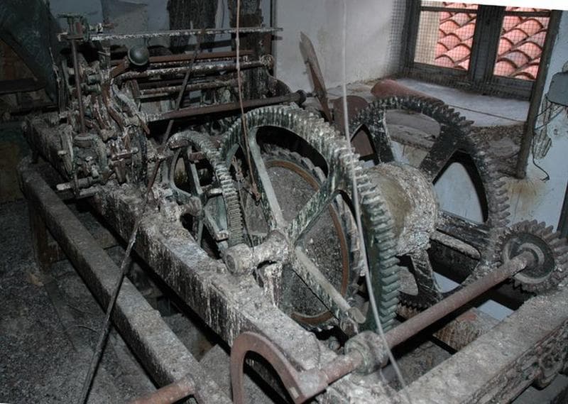 Horloge d'édifice à rouages horizontaux. Bâti en bois (décor sculpté). Engrenages en fer.