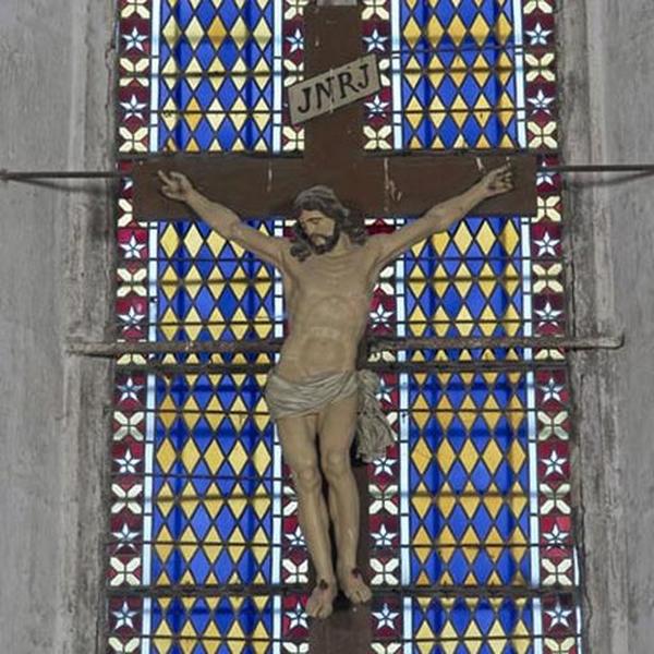 Christ en bois sculpté avec les bras rapportés, peint polychrome. Le Christ est fixé par quatre clous en fer forgé, à tête en forme de pyramide, sur une croix en planches de résineux peinte en marron, avec un <<I>>titulus<</I>> rapporté en forme de planchette oblique.
