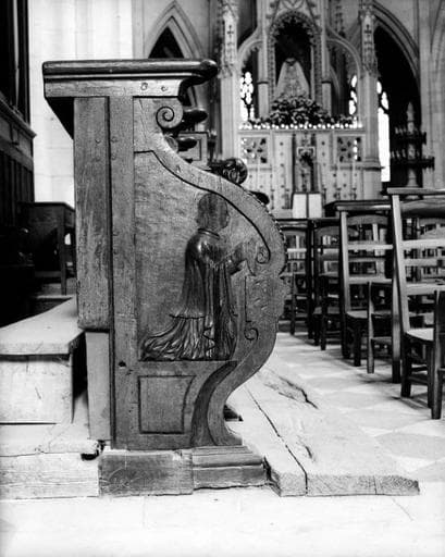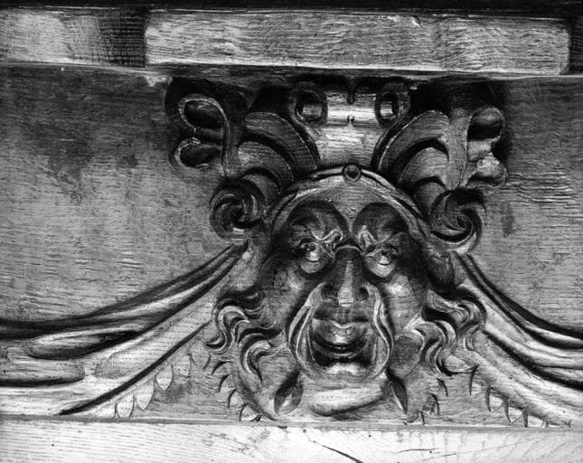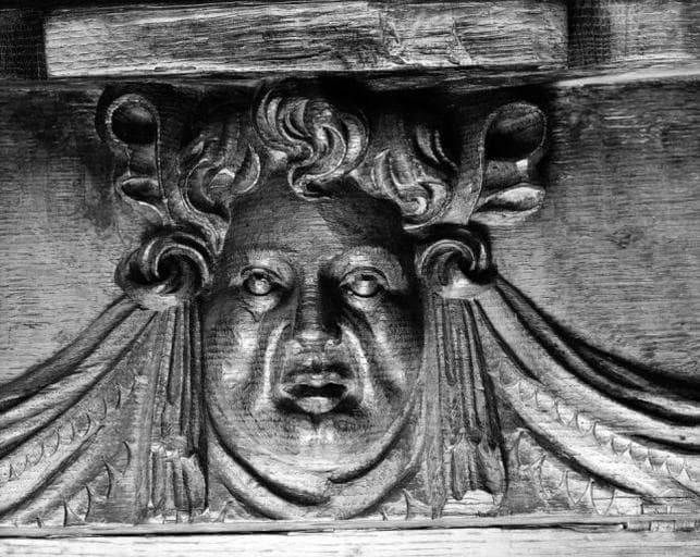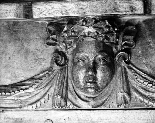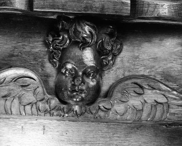 figures (ecclésiastique, agenouillé, prière) ; ornementation (feuillage, mascaron, angelot, tête, grotesque, table saillante)