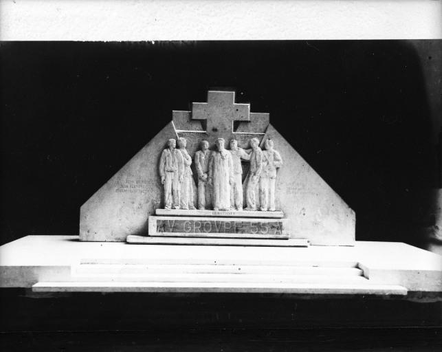 Scènes de résistance représentant la réception de containers parachutés et le plastiquage de pylônes électriques ; têtes de résistants en médaillon ; l'abbé Pasty Emile, est en pied au centre du monument.