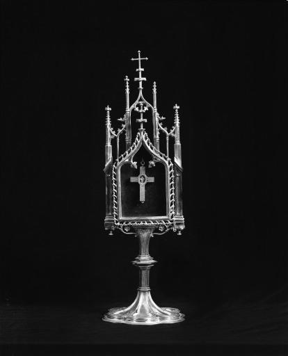 Reliquaire avec décor encadrant une ouverture en accolade ; pied à 6 lobes et tige à noeud ; boîte en cuivre à l'arrière.