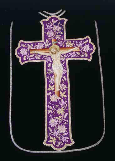 Chasuble en velours noir ras ; croix et bande rapportées au point de croix avec décor végétal ; Christ central en croix avec nuances de fils teints rendant le modelé du corps ; croix au point de croix et nimbe en fils d'argent doré ; galon autour de la chasuble en fils d'argent.