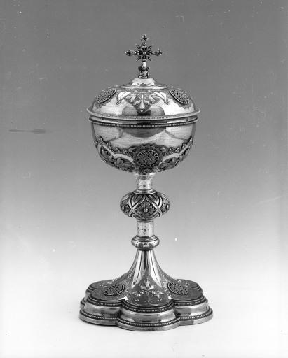 Ciboire en argent doré ; pied à six lobes ; trois médaillons à décor filigrané de volutes rayonnantes décorent respectivement le couvercle, la fausse coupe et le pied et alternent avec trois médaillons à décor de feuilles de vigne ; croix fondue, soudée sur le couvercle.
