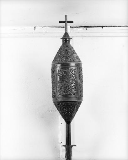 Lanterne à corps central cylindrique en fer terminé à chaque extrémité par un cône ; celui du dessous possède une douille et celui du dessus une croix ; l'ensemble est percé de trous dessinant des cercles et des étoiles ; un petit vantail de fer cintré s'ouvre dans le corps central.