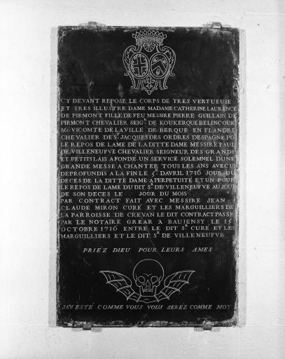 Inscription : Cy devant repose le corps de très vertueuse et très illustre dame madame Catherine Laurence de Pirmont, fille de feu messire Pierre Guillain de Pirmont, chevalier seigr de Koukerque Belincour et vicomte de la ville de Berque en Flandre, chevalier de st Jacques des ordres despagne por le repos de lame de la ditte dame, messire Paul de Villeneufve, chevalier seigneur des grands et petits Lais a fondé un service solemnel d'une grande messe à chanter tous les ans avec un deprofundis à la fin le 5e avril 1716, jour du décès de la ditte dame à perpétuité et un pour le repos de lame du dit sr de Villeneufve au jour de son décès, le jour du mois par contract fait avec messire Jean Claude Miron, curé et les marguilliers de la paroisse de Crevan le dit contract passé par le notaire Grear à Baujensy, le 15 octobre 1716, entre le dit sr curé et les marguilliers et le dit sr de Villeneufve ; priez pour leurs âmes ; inscription : j'ay este comme vous vous serez comme moy ; armoiries dans 2 écus ovales ; le premier représente une croix ancrée et le second a un losange et 3 glands de chêne posés 2 et 1 ; une couronne comtale surmonte le tout.