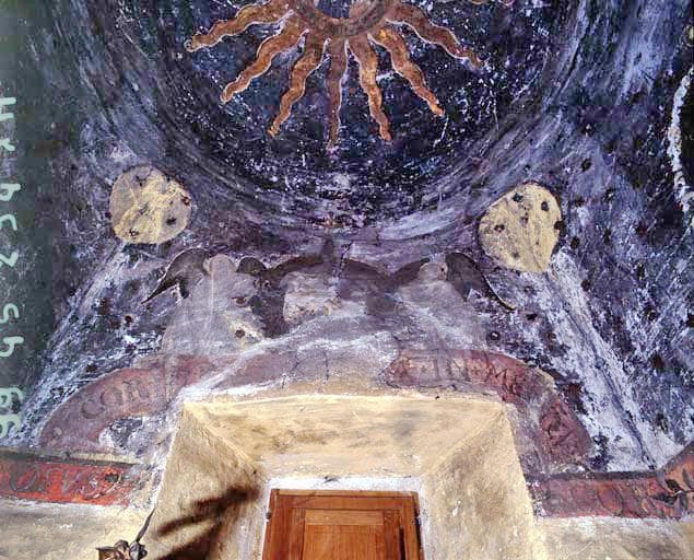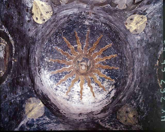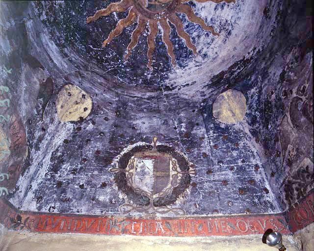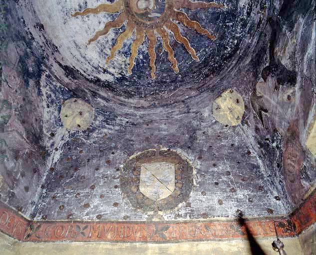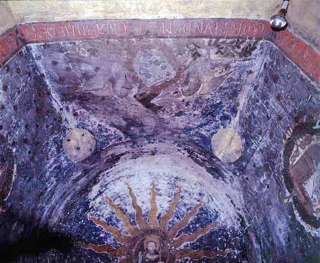 Peinture posée sur la voûte en coupole et en partie haute des murs ; les étoiles du ciel sont en relief (sans doute en plâtre) et dorées.