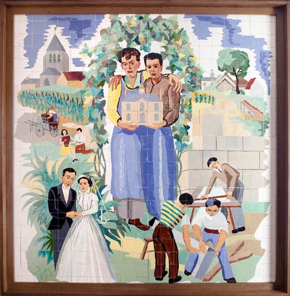 cycle thématique (allégorie : ville, Saint-Jean-de-Braye) ; allégorie : agriculture, allégorie : architecture ; allégorie : construction, ville : Saint-Jean-de-Braye, église, Loire, hôtel de ville, mariage ; allégorie : les arts, allégorie : la paix, culture, colombe